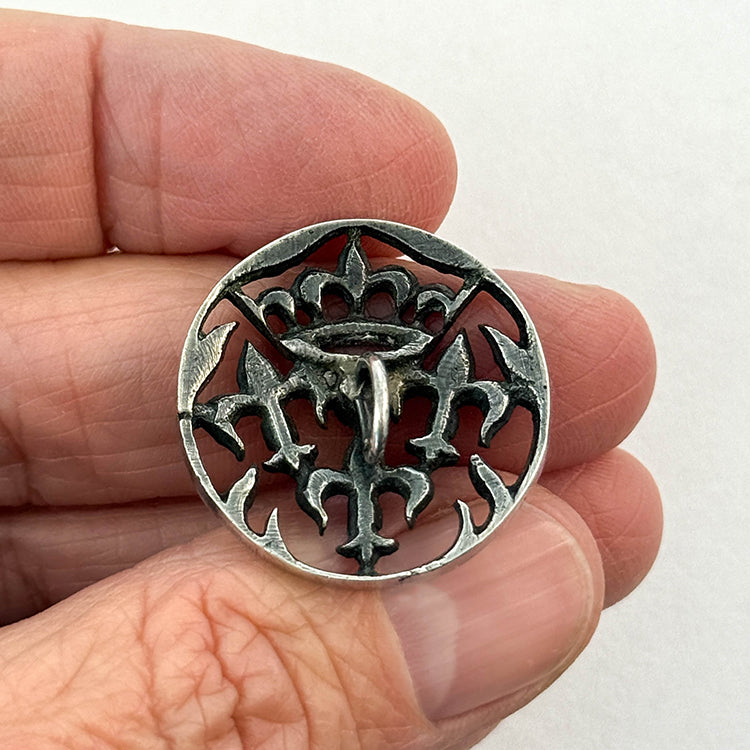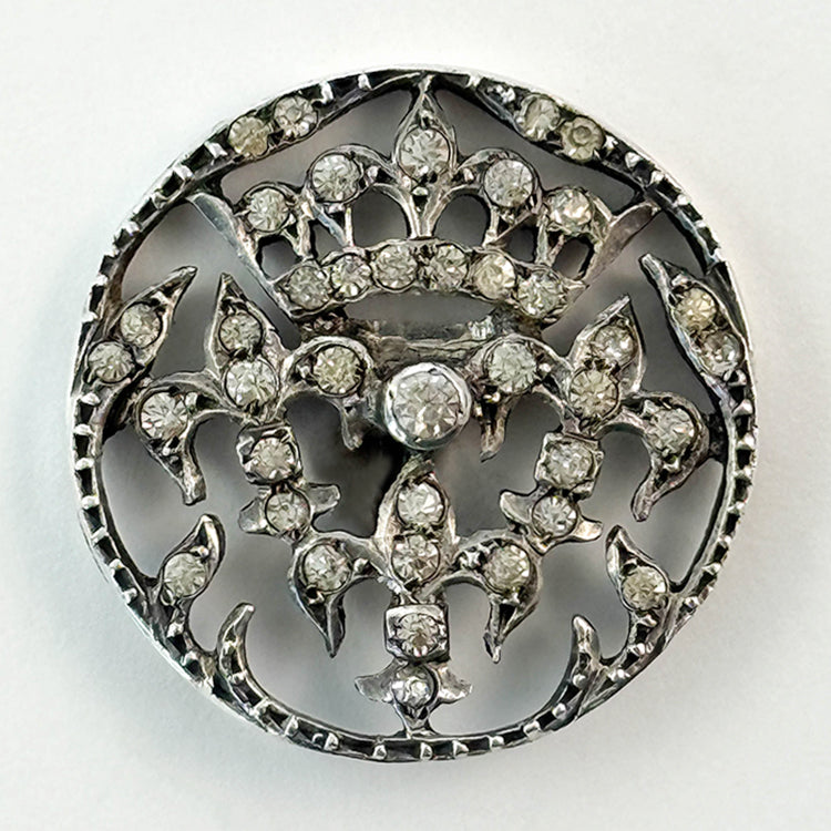 Three fleurs de lis are topped by a coronet on a paste jewel with a complex cast silver armature. 19th C. Div. I Size M 1 1/16"