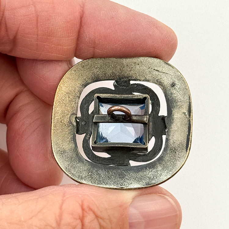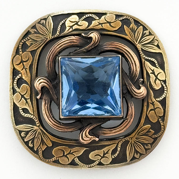 Square Gay 90s with a flowering vine border & cornerflower-blue square jewel. 19th C. Div. I Size L 1 1/2"