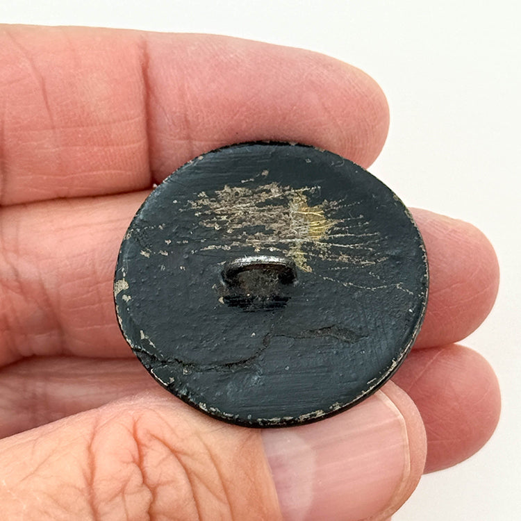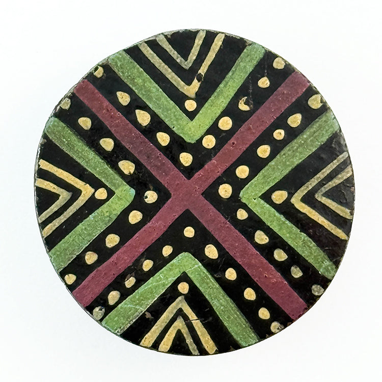 Forged iron disk with original paint in a cross pattern with chevrons and dots. A rare material for an 18th-C assorted materials tray. 18th C. Div. I Size L 1 1/4"