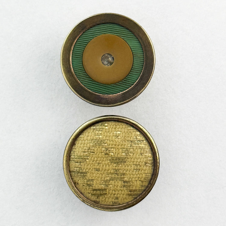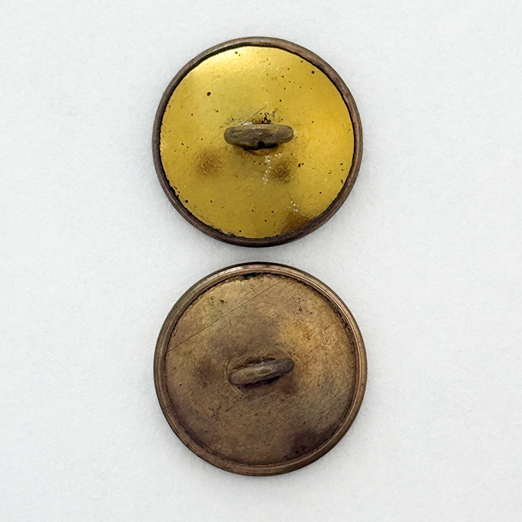 Two medium Birmingham trades, a fabric under celluloid shield, and a three-materials with vegetable ivory. Late 19th/Early 20th C. Div. I Size M 13/16"