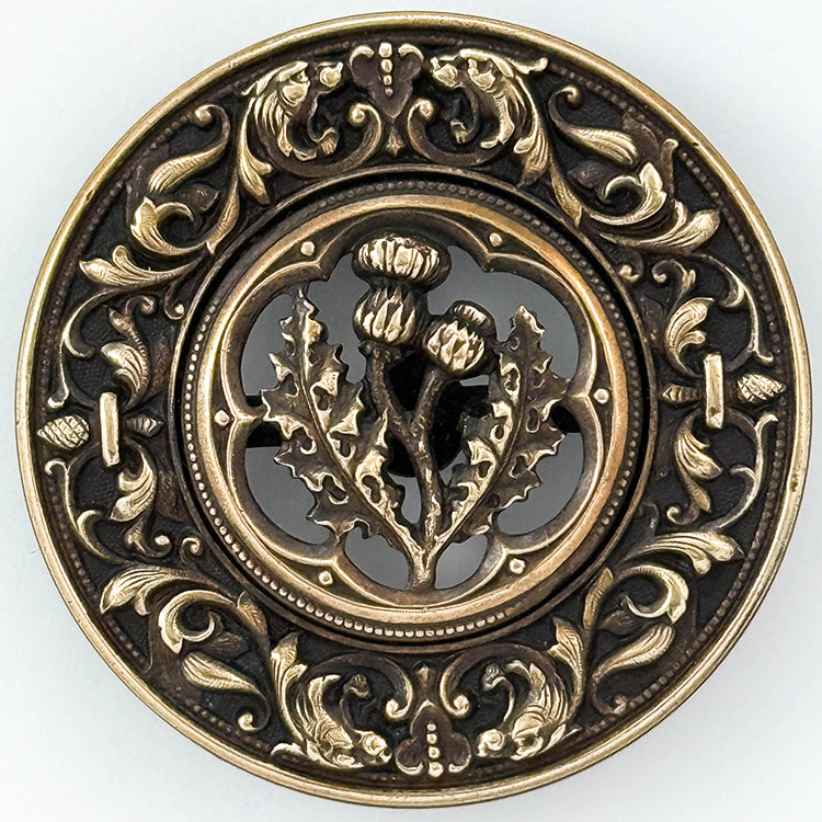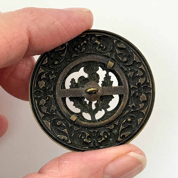 Large Victorian-era brass picture button of highly detailed openwork brass. 19th C. Div. I Size L 1 9/16"