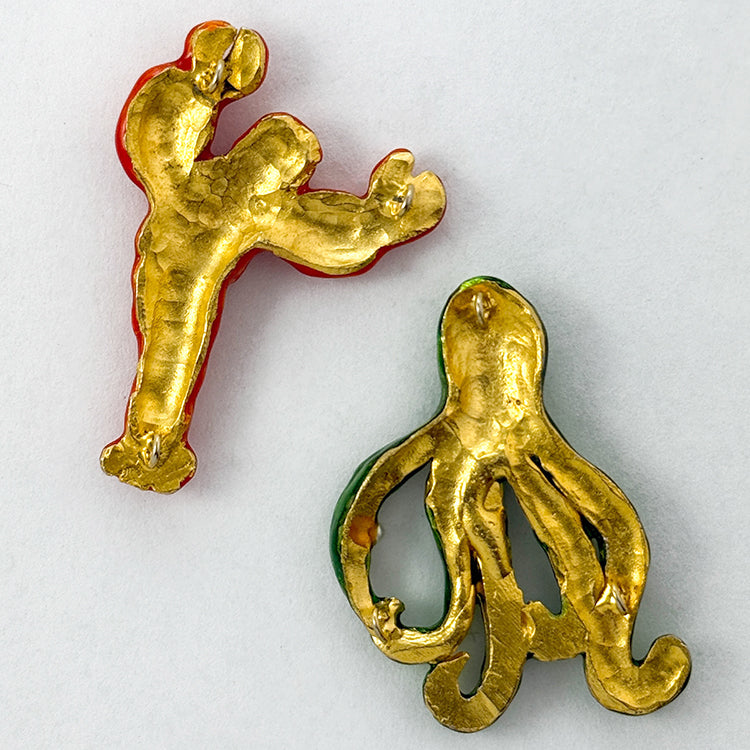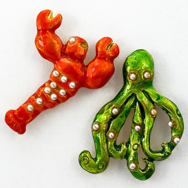 Cold enamel finished trim: a lobster and an octopus. Each has 3 shanks. 20th/ 21st C. Div. IV Size L 1 7/8"