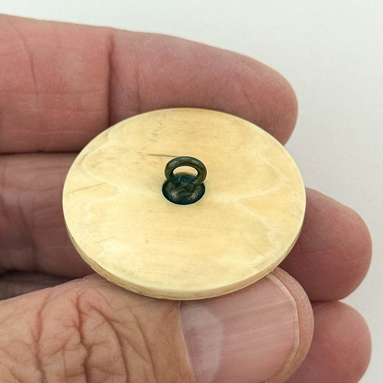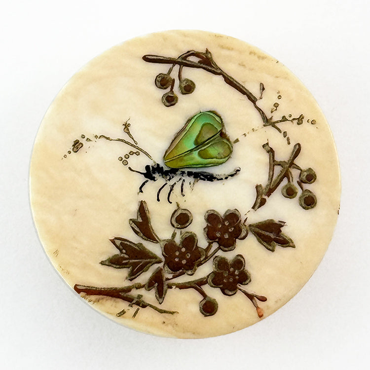 Elegant button of lacquered natural material with inset abalone for the insect's wings. 19th C. Div. I Size L 1 1/4"