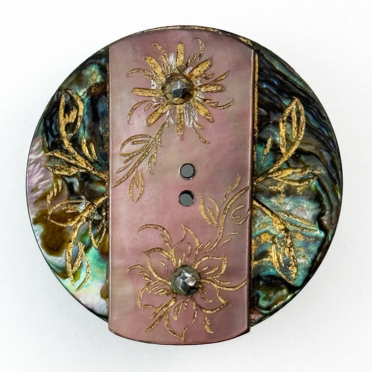 Large abalone shell sew-thru with grey oyster overlay & cut steels. 19th C. Div. I Size M 1 1/4"