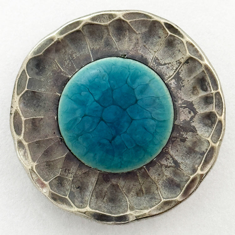 Ruskin pottery disk inset in backmarked pewter. English Arts & Crafts. Early 20th C. Div. I Size L 1 7/16"