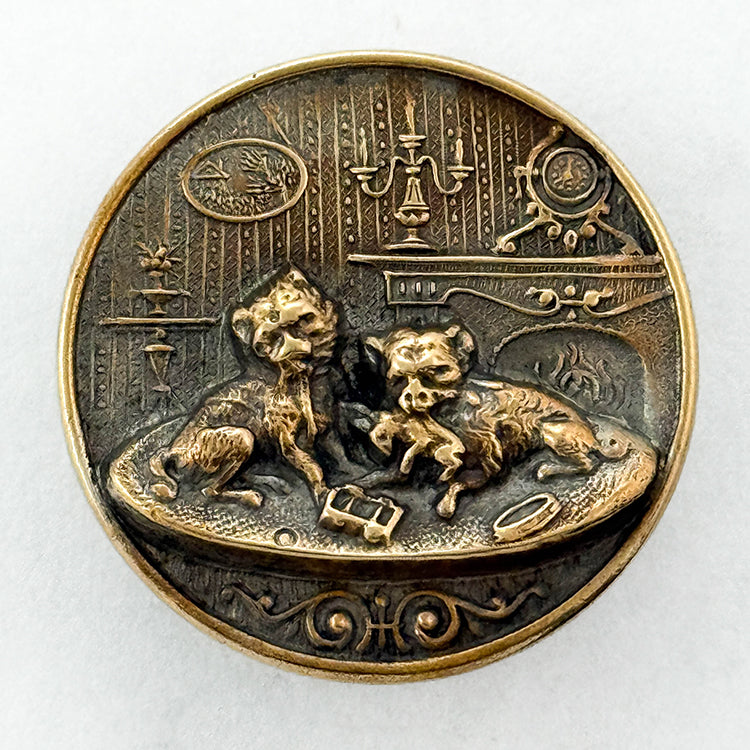 Great Paris backmark on this charming brass button featuring two destructive puppies. 19th C. Div. I Size M 1 3/16"
