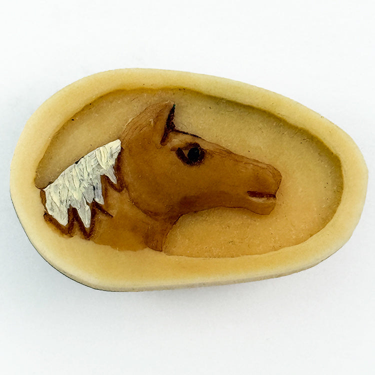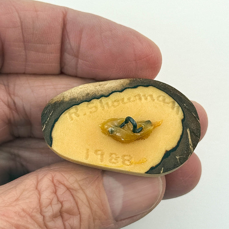 Carved & tinted vegetable ivory. Signed "Ray Sherman 1988". 20th C. Div. III Size L 1 9/16"